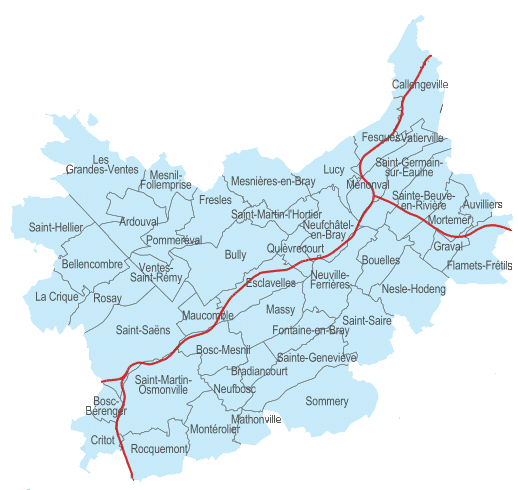 Ses communes principales sont Neufchâtel-en-Bray, Saint-Saëns, Les Grandes Ventes et Mesnières-en-Bray. Ces communes sont identifiées dans le projet de SCoT (piloté par le Pôle d’Equilibre Territorial du Pays de Bray) comme polarités principales pour Saint-Saëns et Neufchâtel-en-Bray et comme pôle de proximité pour les Grandes Ventes et Mesnières-en-Bray.